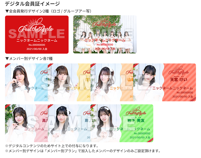 月額:各2,750円会員番号付きデジタル会員証◯◯FC先行チケット販売◯ ×推しメン設定◯◯ギャラリー◯◯ムービー◯◯誕生日メッセージ◯◯FC限定グッズ購入権◯◯メッセージBLOG×◯デジタル特典券